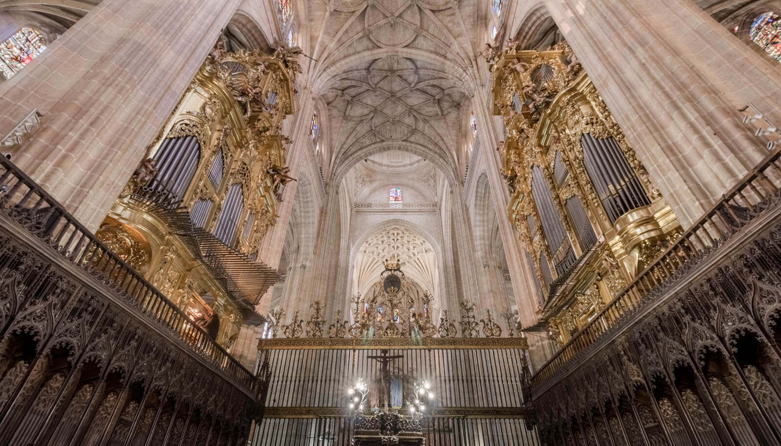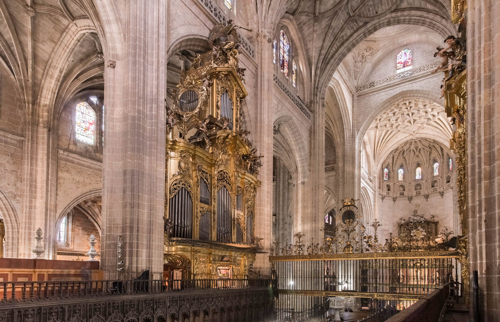 El órgano del Evangelio (lado norte) del coro de la catedral de Segovia es una de las obras cumbre en su estilo, lo que llamamos órgano barroco español y el mayor de los conservados de la familia Echevarría.