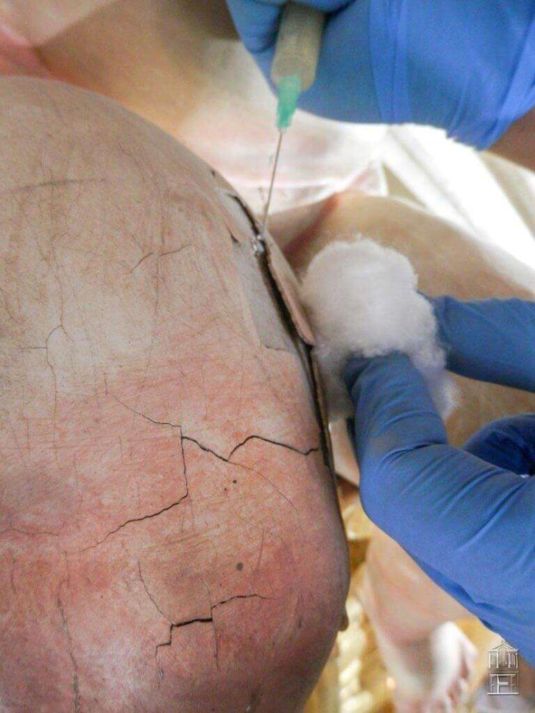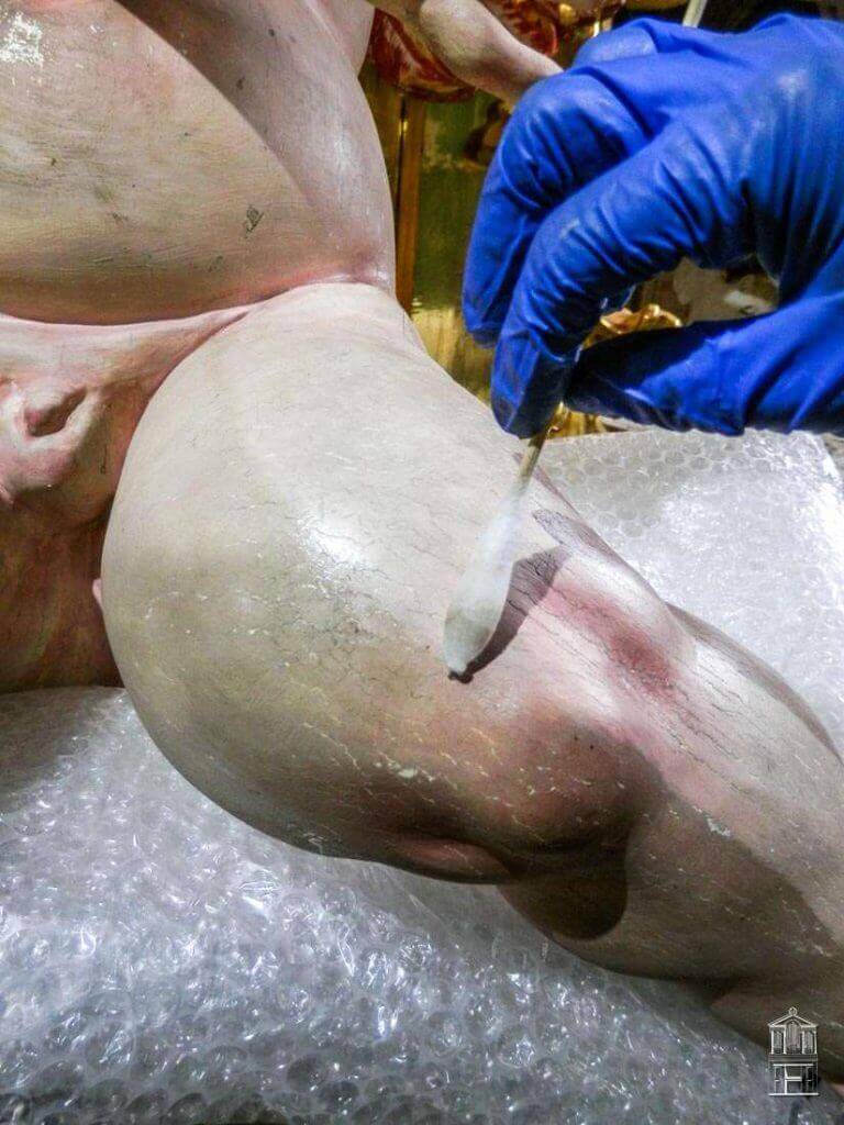Tras realizar diferentes pruebas de fijación y sentado del color y el oro, se desarrollaron los trabajos para asegurar así la buena conservación de los estratos pictóricos originales.