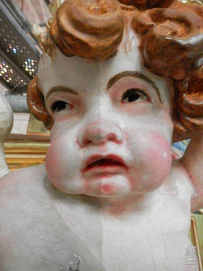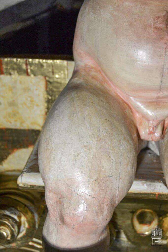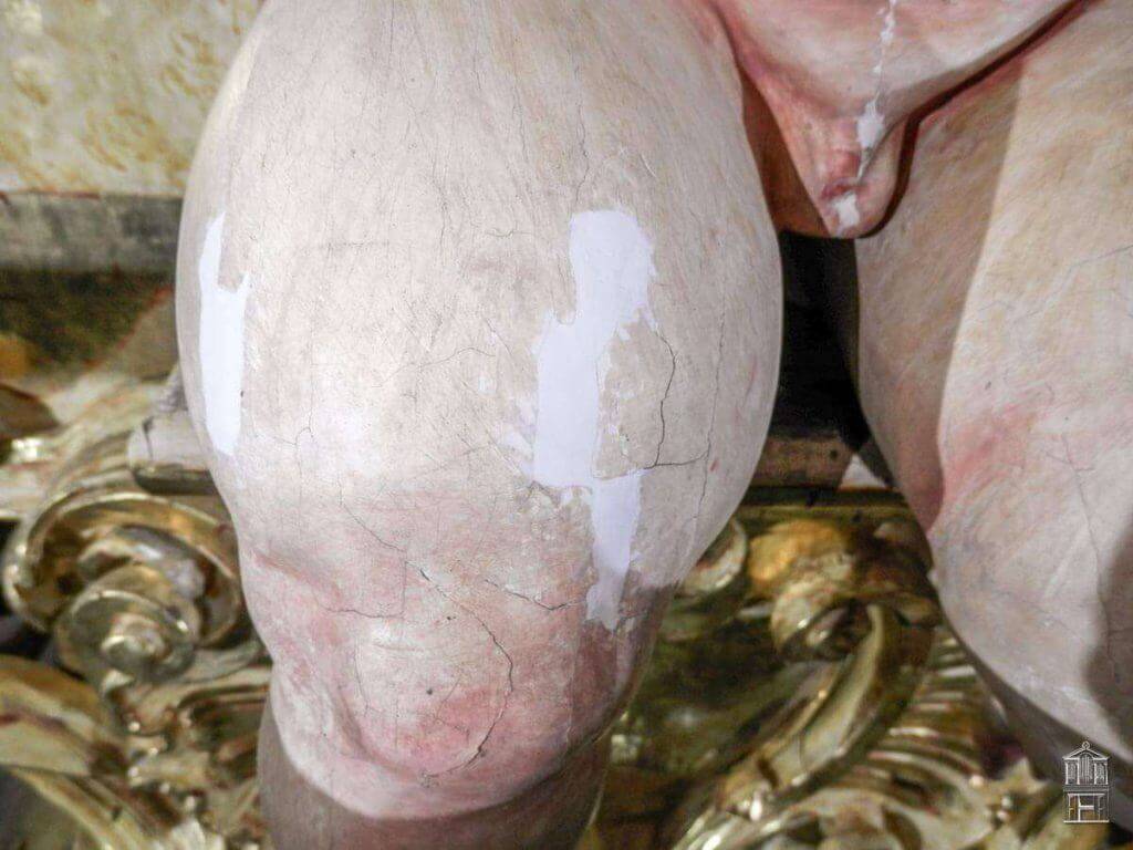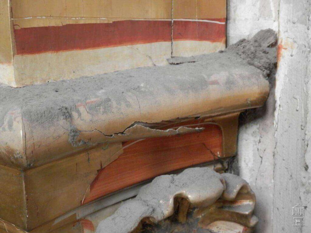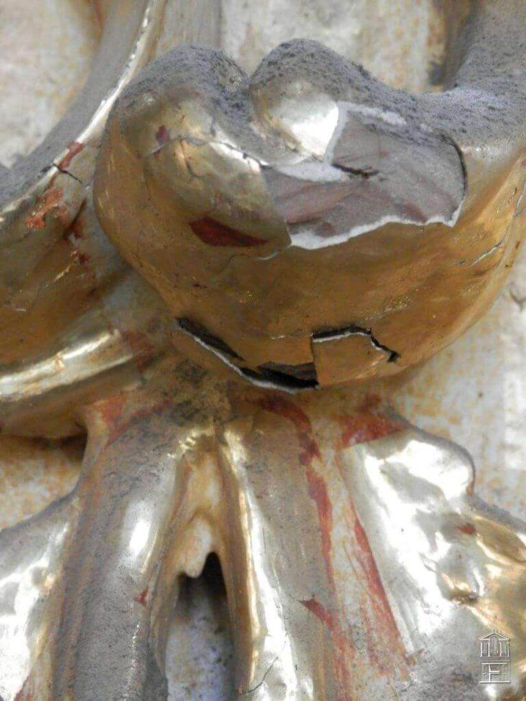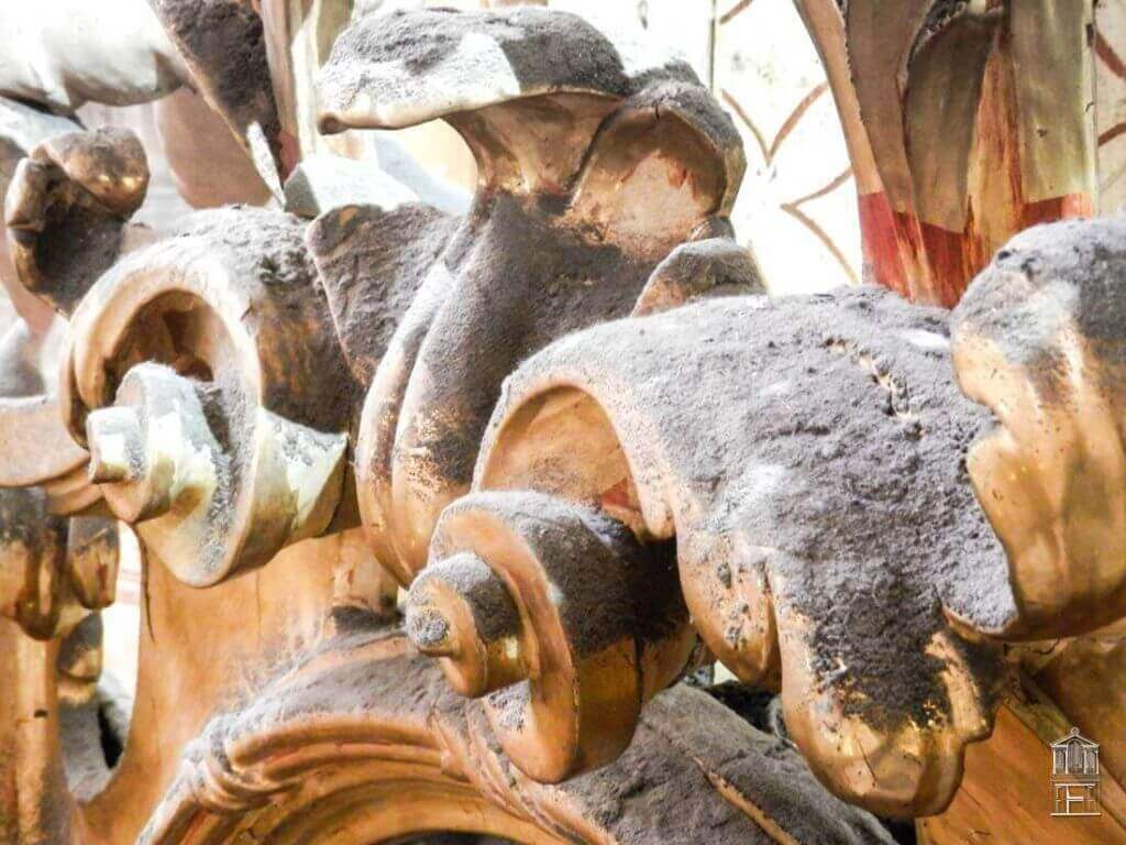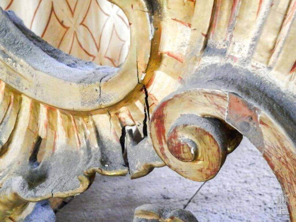 Después de realizar un exhaustivo barrido fotográfico para documentar el estado inicial en el que se encontraba esta fachada de estilo barroco, se fue realizando una limpieza superficial de todo el mueble. Las graves acumulaciones de polvo y suciedad impedían ver con claridad los graves levantamientos y el estado original de los diferentes estratos de la policromía.