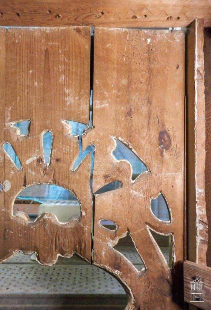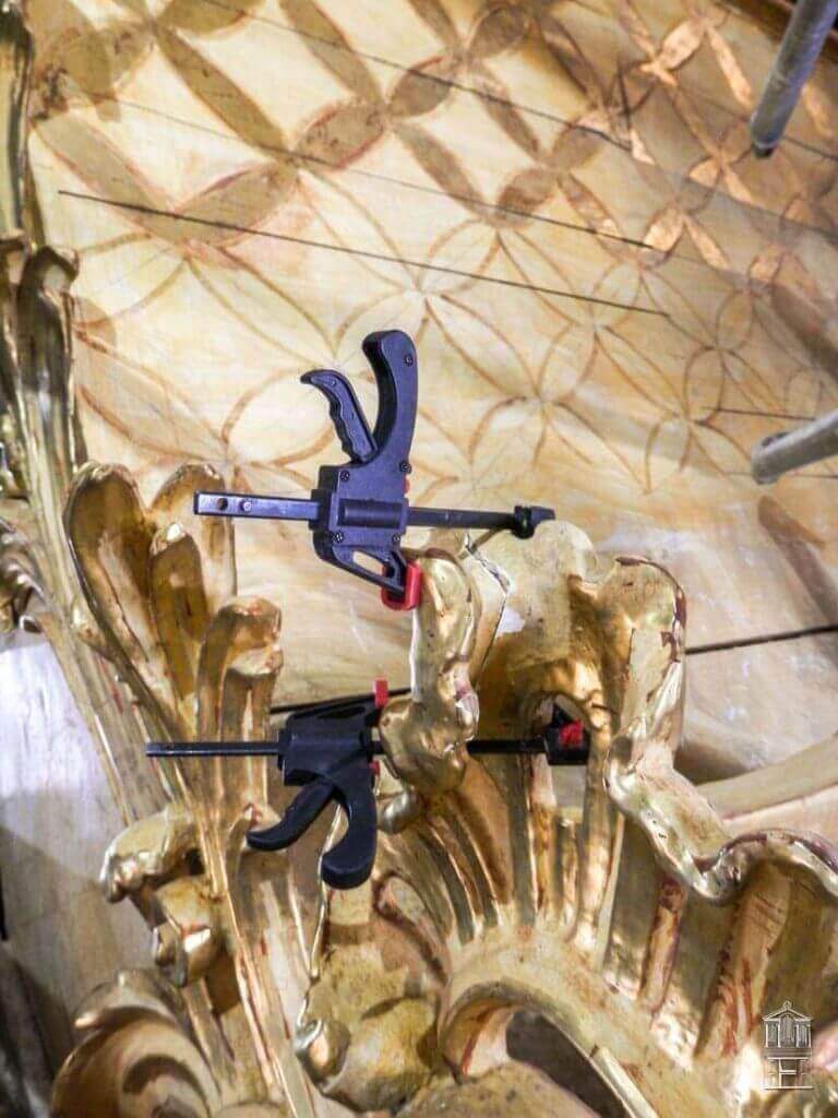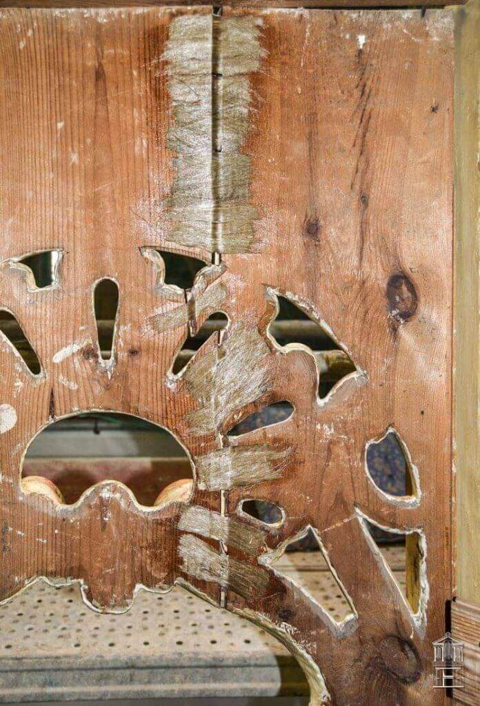Los trabajos de carpintería consistieron en reforzar por los reversos algunas piezas que contenían movimientos en su soporte ligneo. El encolado de piezas sueltas, algunas de ellas encontradas desubicadas, y la reconstrucción de algún fragmento de talla que visualmente llamaba la atención y rompía con la visión global del mueble son los trabajos más relevantes en la intervención del mueble.