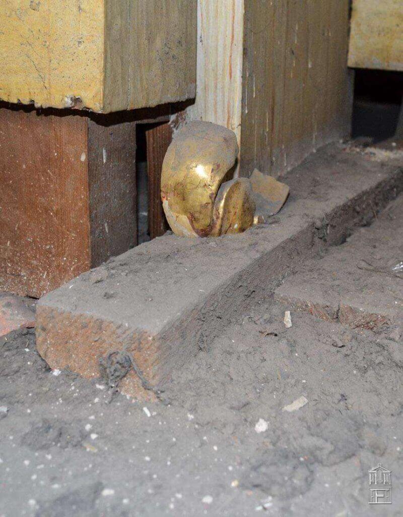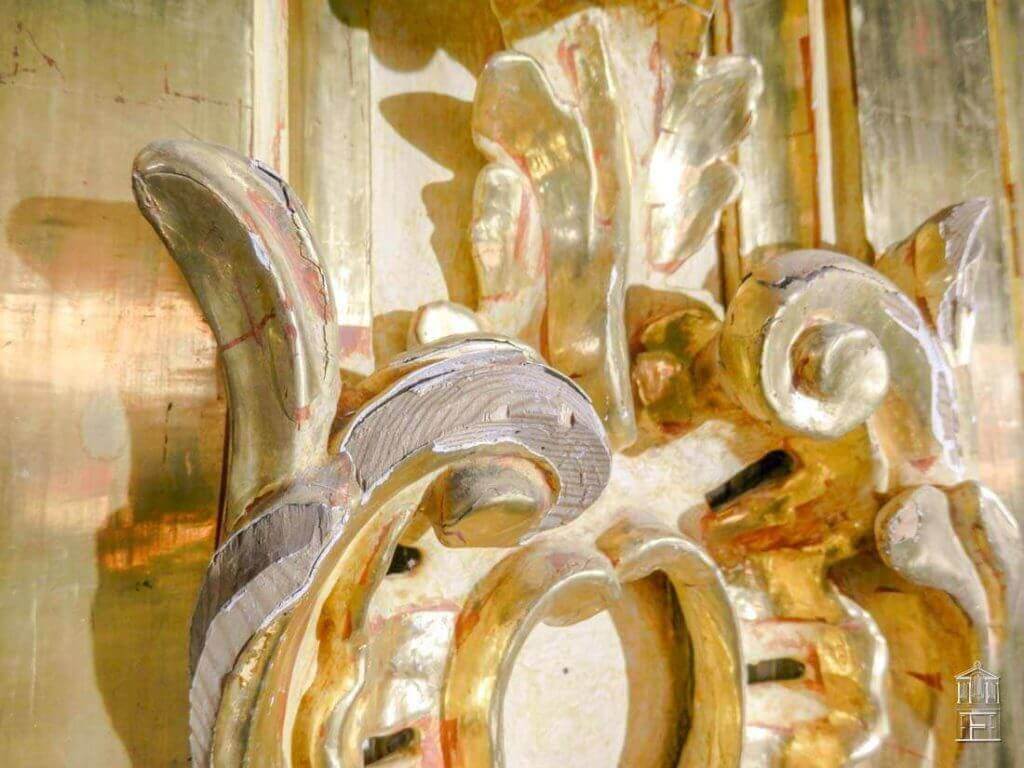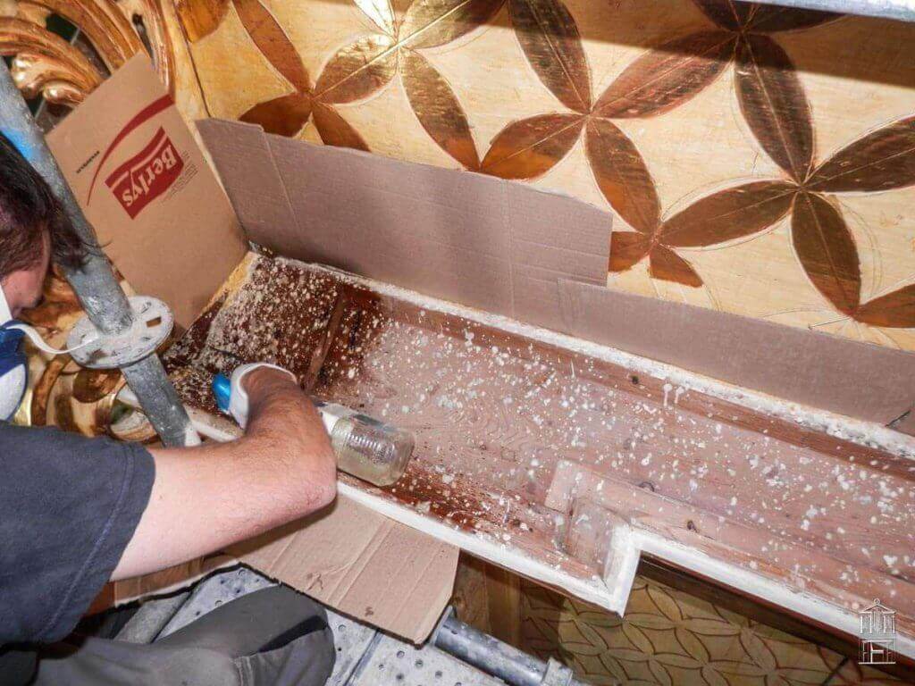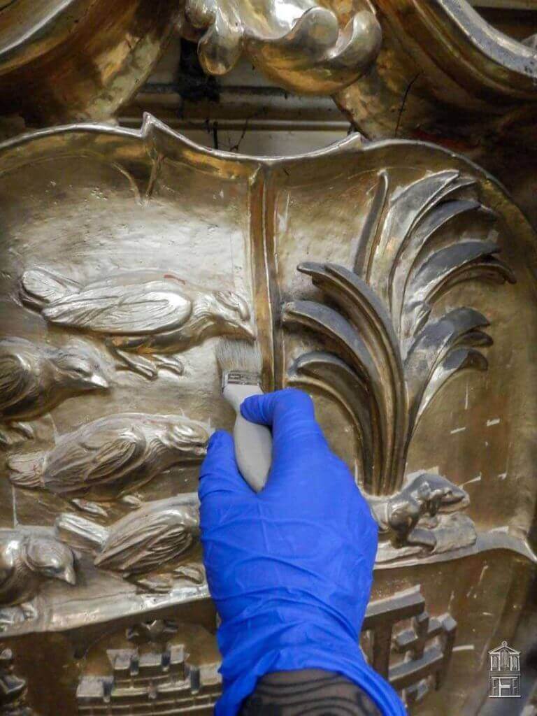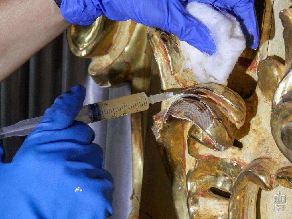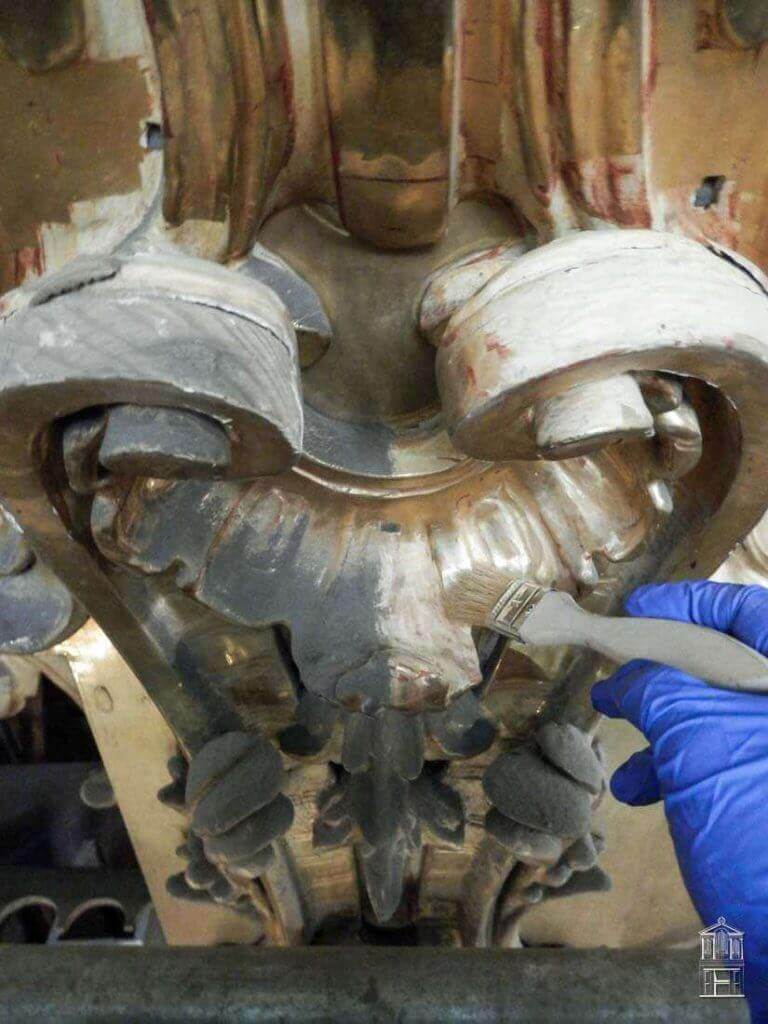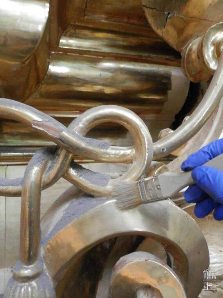 El tratamiento preventivo antixilófagos aplicado sobre la madera vista original, el tratamiento de limpieza y protección de los metales y hierros que aparecen por el mueble que realizan una función fundamental en la estructura del mueble son otros de los trabajos de conservación que componen las fases de actuación en esta obra.