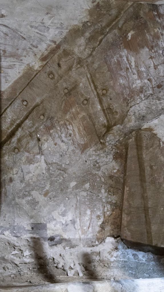 A consecuencia de este desfase y también a contracciones de la madera la cara exterior presentaba una grieta de gran tamaño en la arista izquierda.