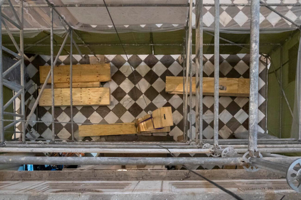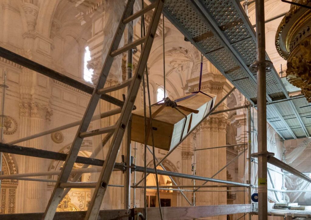 Después de su restauración en el taller de Tordesillas, se traslada toda la tubería de fachada para colocarla en su ubicación final.