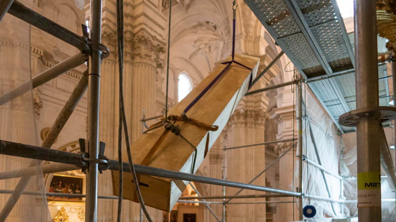 Después de su restauración en el taller de Tordesillas, se traslada toda la tubería de fachada para colocarla en su ubicación final.