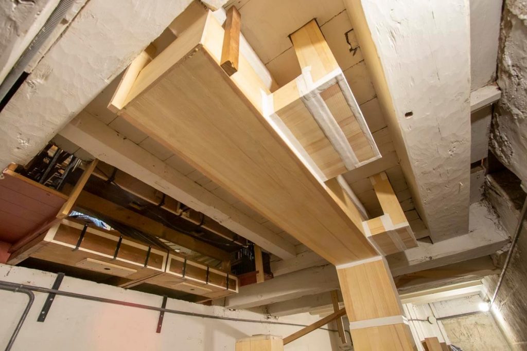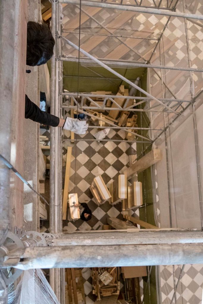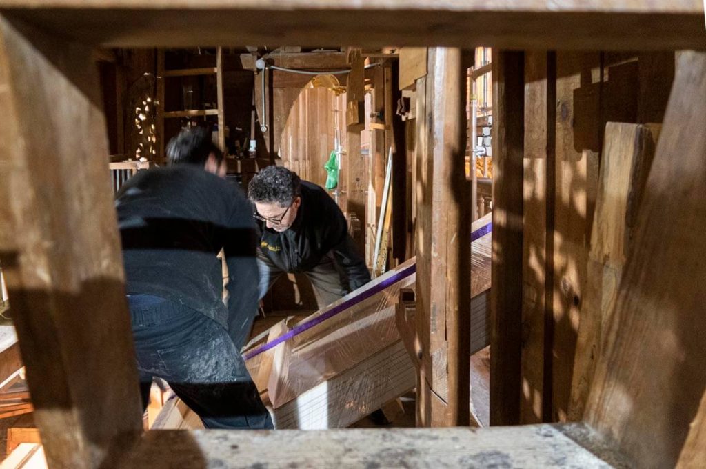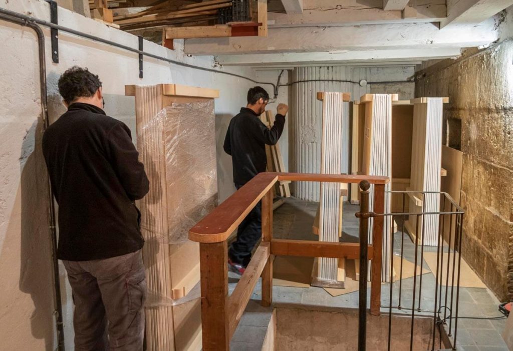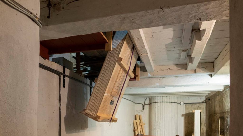 Subimos los secretos hasta el cuarto de los fuelles, al estar desmontados todos los secretos los fuelles entran desde el cuerpo bajo por el hueco abierto que deja paso al arca de viento de la cadereta interior.