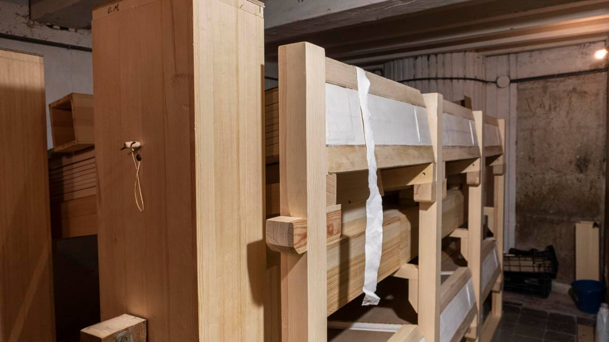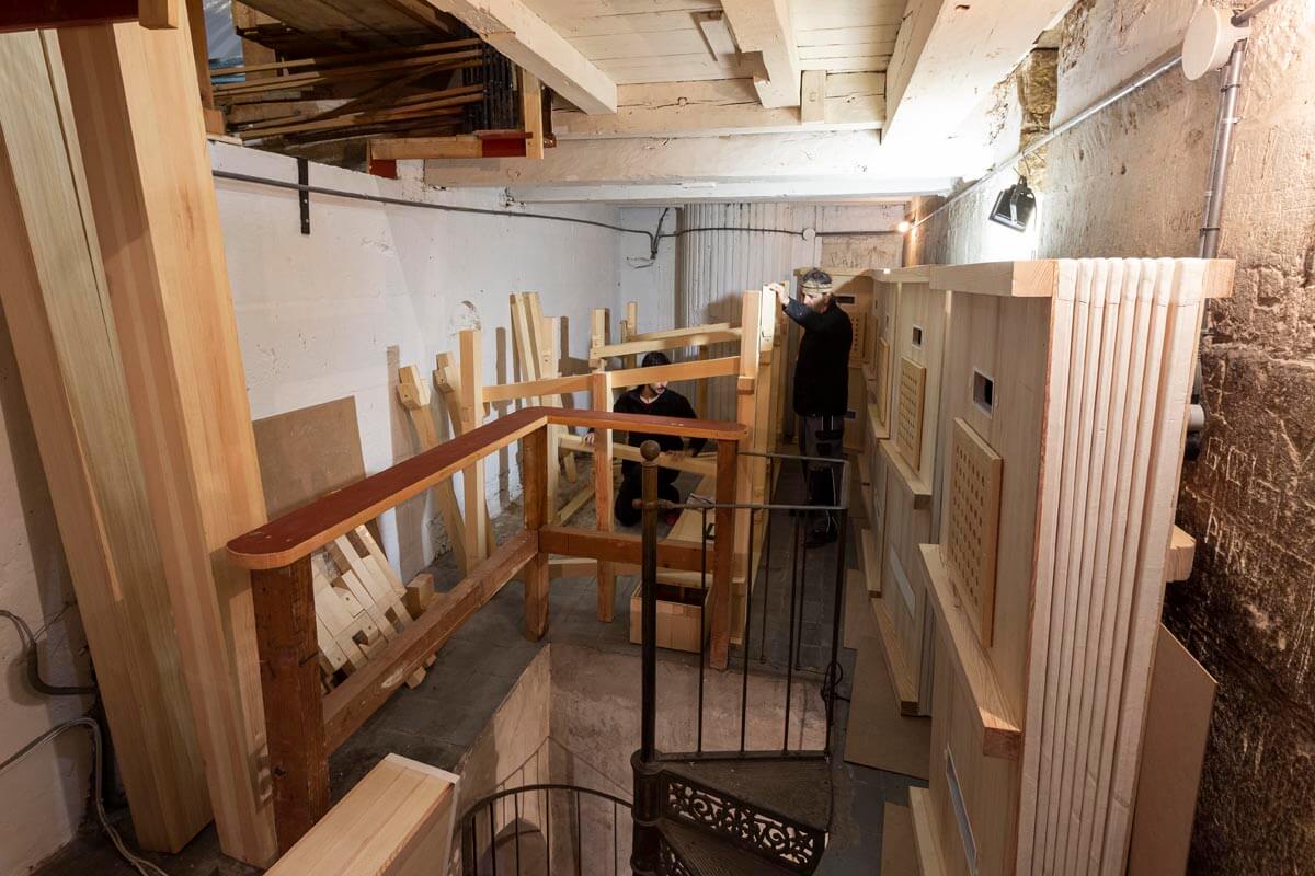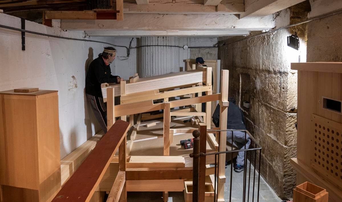 Subimos los secretos hasta el cuarto de los fuelles, al estar desmontados todos los secretos los fuelles entran desde el cuerpo bajo por el hueco abierto que deja paso al arca de viento de la cadereta interior.