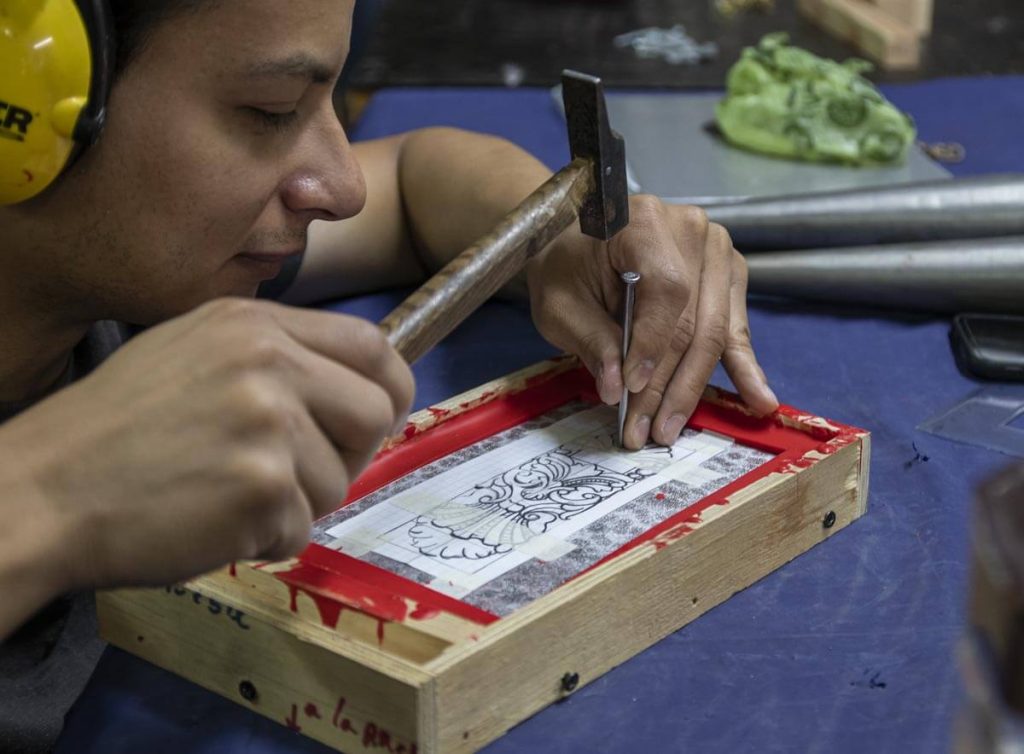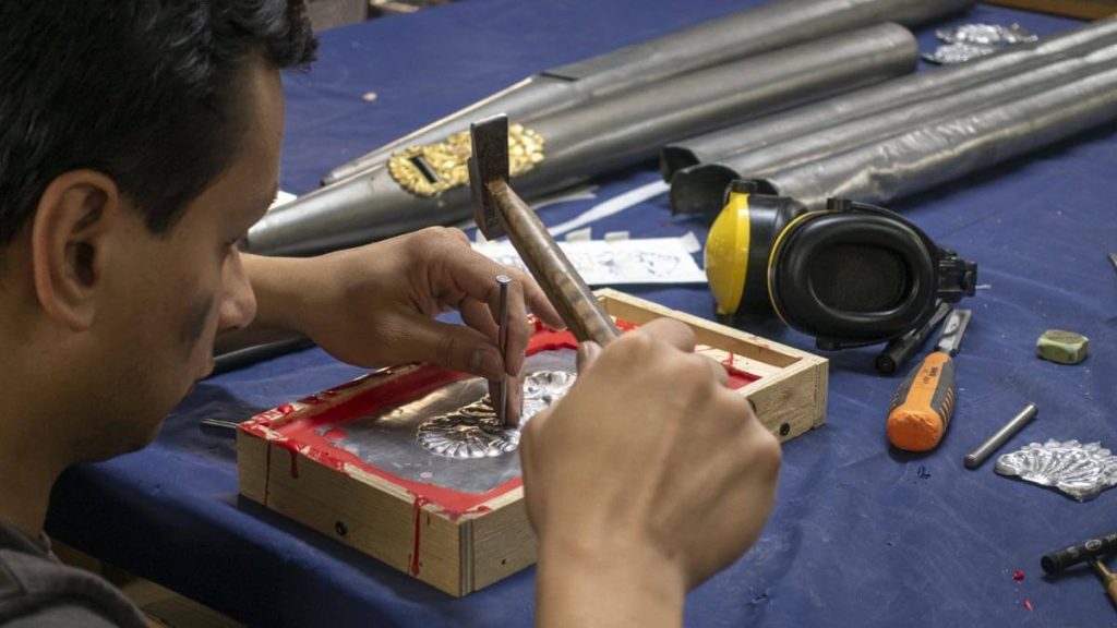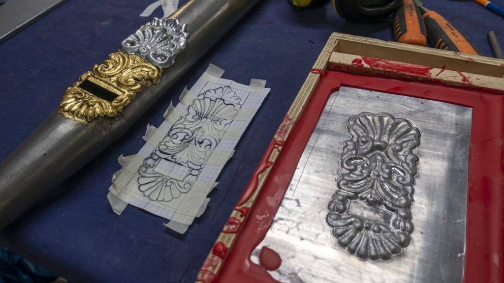 Las máscaras que llevan en la boca están repujadas en piezas de similar aleación a los tubos.
